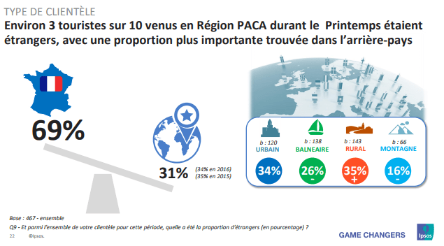 Les touristes étrangers représentent 31% de la clientèle estivale Azuréenne en 2017, ils sont principalement Anglais et Italien dans les Alpes maritimes. (Source IPSOS)